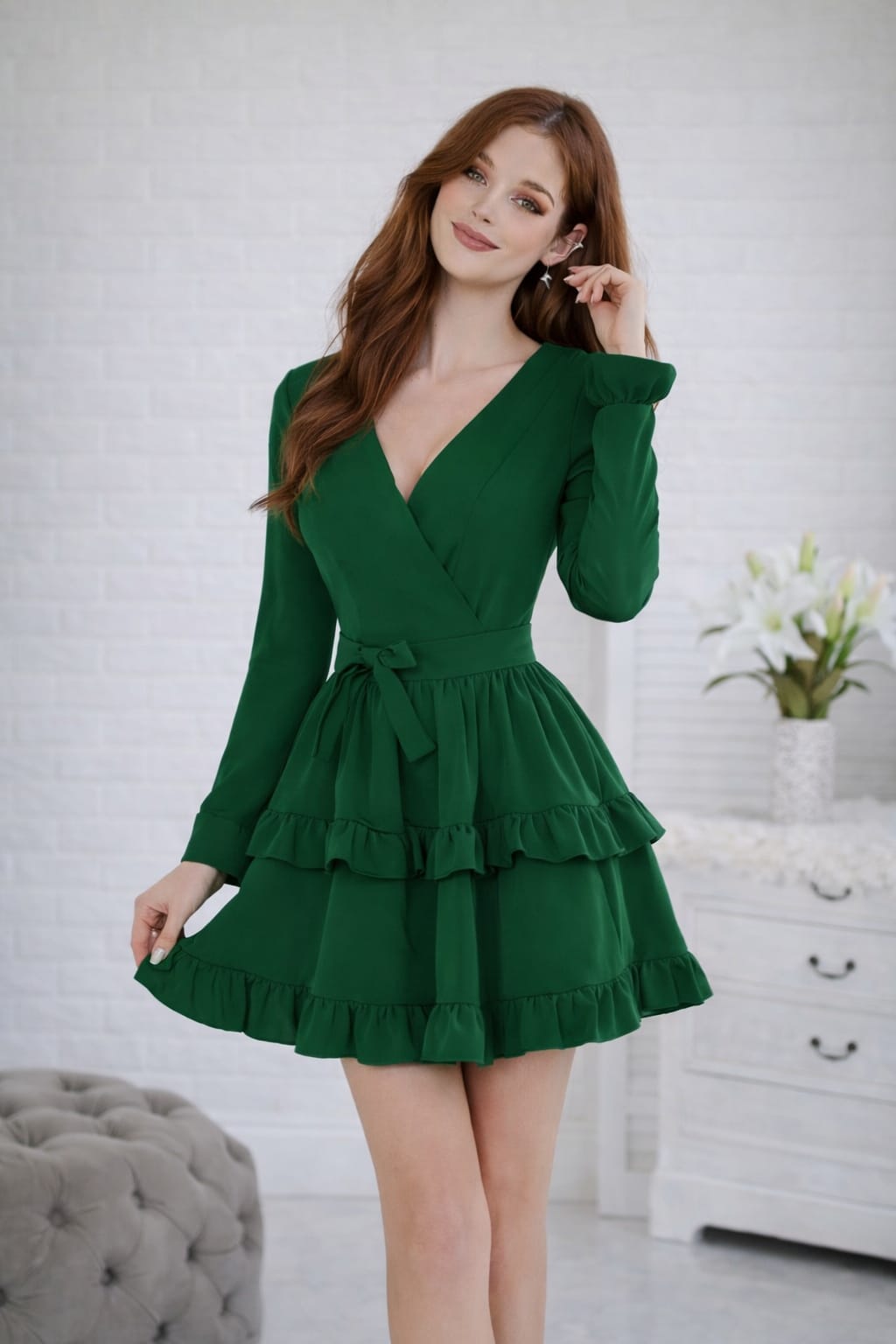 O rochie lejeră și feminină, realizată din voal fin, cu croi în două rânduri de volane care oferă un efect jucăuș și elegant. Talia este accentuată cu cordon, iar decolteul în V complimentează frumos silueta. Perfectă pentru zile speciale, evenimente